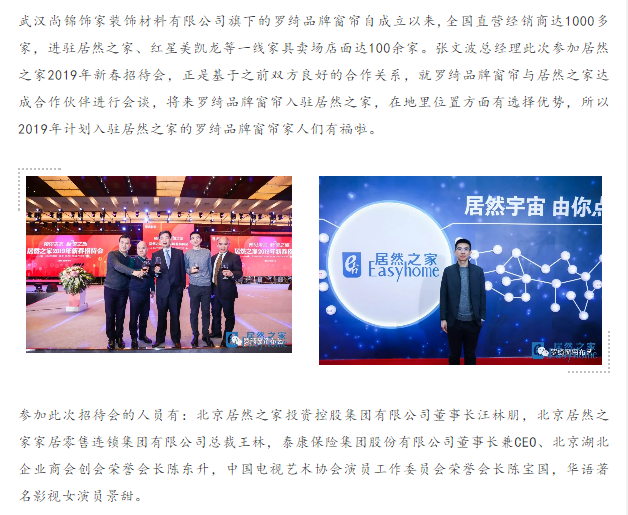 - 2019年01月06日,武汉尚锦饰家装饰材料有限公司市场部总经理张文波先生应北京居然之家投资控股集团有限公司的邀请赴北京国家会议中心参加居然之家2019年新春招待会
